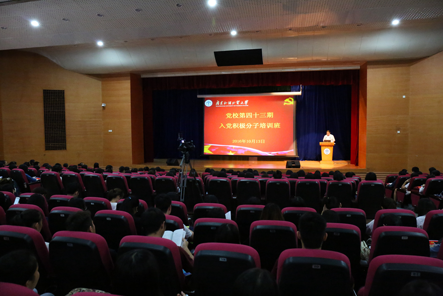 本网讯 10月20日下午,我校党委书记、党校校长隋广军“以实际行动成为一名真正的共产党员” 为主题,在北校区六教报告厅为北校区279名学员入党积极分子讲授党课。自10月13日第四十三期入党积极分子培训班开班以来,校党委副书记石佑启,党委常委、副校长刘海春,党委宣传部部长胡文涛等先后为学员授课。开班典礼由校党委组织部部长、党委统战部部长方迎生主持。