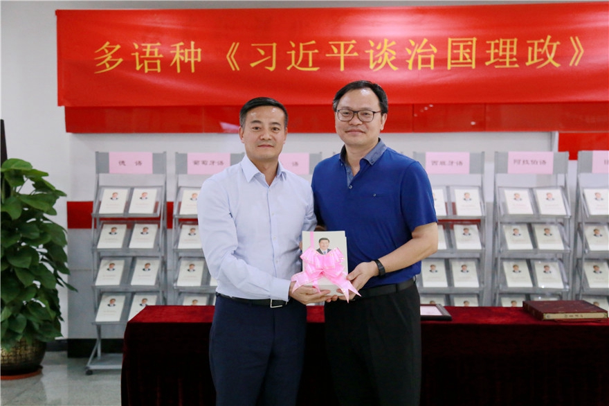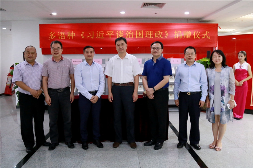 本网讯 9月29日,北京崇学文化发展有限公司向我校捐赠德语、葡萄牙语、英语、法语、西班牙语、阿拉伯语、日语七语种280册《习近平谈治国理政》图书。在捐赠仪式上,校党委书记隋广军表示此书到来“恰逢其时”,为广外师生带来“雨露甘霖”。北京崇学文化发展有限公司负责人余富文,我校副校长刘建达,党办校办主任植秀聪,党委宣传部部长胡文涛,图书馆馆长孔晓明、图书馆党总支书记范静静等出席仪式。