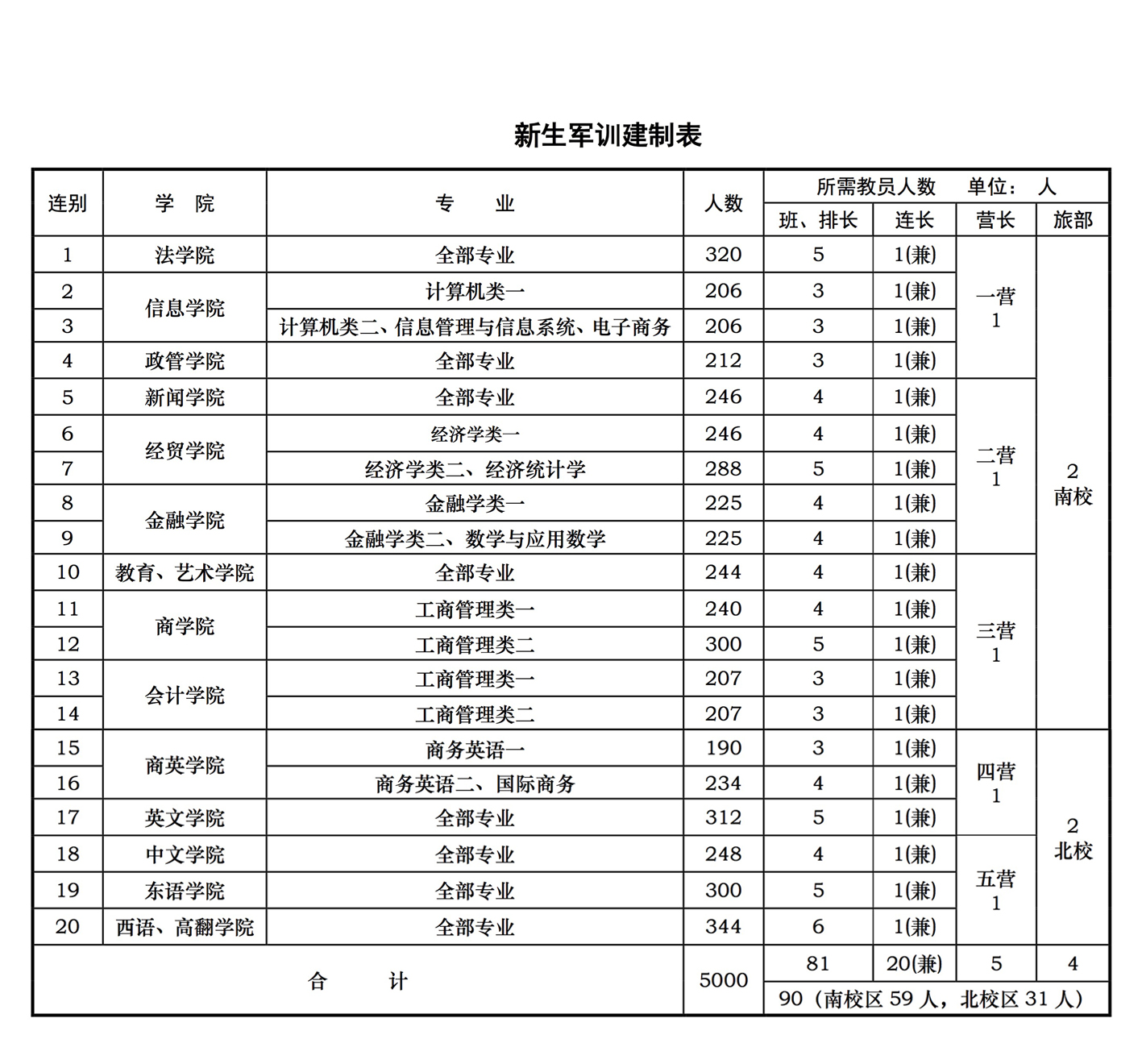 1.全旅下设5个营,20个连,81个班(排),学生合计5000人,教官共90人。具体编制安排如下:一营:法学院、信息学院、政管学院,设立 4 个连,14 个班(排),944 人;二营:新闻学院、经贸学院、金融学院,设立 5 个连,21 个班(排),1230 人; 三营:教育学院、艺术学院、商学院、会计学院,设立 5 个连,19 个班(排),1198 人; 四营:商英学院、英文学院,设立 3 个连,12 个班(排),736 人;五营:中文学院、东语学院、西语学院、高翻学院,设立 3 个连,15 个班(排),892 人。 每个班(排)一般为 60-70 名学生,具体班(排)建制可以根据实际需要进行调整。