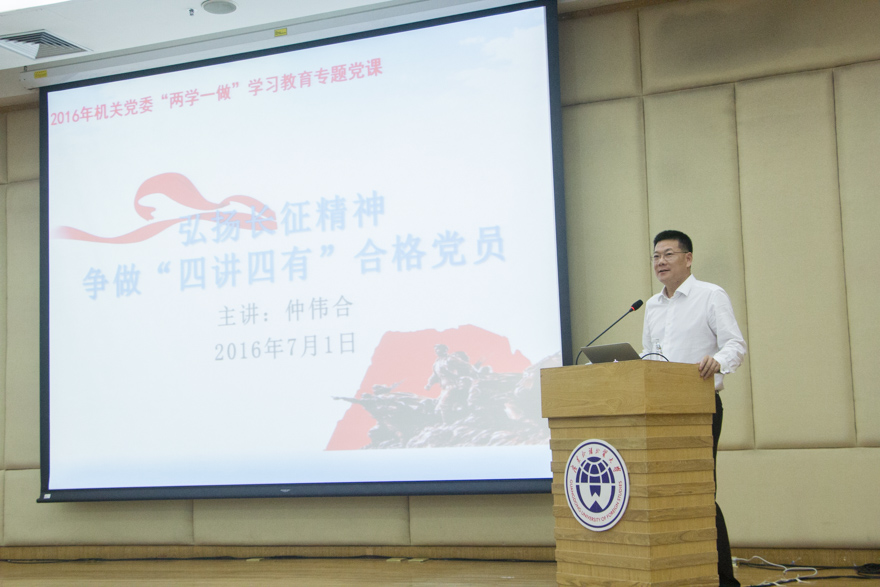 本网讯 今年7月1日正值中国共产党建党95周年纪念日。在图书馆多功能报告厅,我校党委副书记、校长仲伟合为200名教职工党员上党课。今年又正值红军长征胜利80周年,党课结合“弘扬长征精神 和正在开展的“两学一做”教育学习展开。机关党委全体党员干部,后勤处党总支、离退处党委党员代表听取了党课。