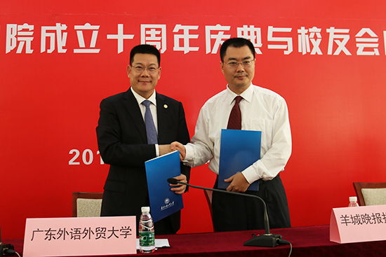 我校与羊城晚报报业集团多年来一直保持友好合作关系,2013年4月22日,双方签署战略合作框架协议,在培养管理干部及新闻专业人才等方面开展一系列深度合作。2015年6月14日,双方又在此基础上进一步签署协议,共同组建“广外—羊晚全媒体与国际传播研究院”,研究院依托羊城晚报融合媒体优势,以及广东外语外贸大学新闻与传播学院国际化办学特色,旨在将其建设成为集全媒体发展、科学研究、人才培养、社会服务等多领域“政-媒-产学研一体化”的新型高端智库型平台。研究院下设:卓越新闻传播人才培养基地、多语种国际舆情研究中心、全媒体创新实验中心、政府传播与危机管理咨询实训中心、区域形象与品牌传播咨询策划研究所、广外—羊晚新闻传播图书资料中心,以及秘书处等机构,着重围绕“卓越新闻传播人才培养、多语种国际舆情分析、全媒体创新实践教学、政府传播与危机管理咨询、品牌策划与区域形象塑造”等领域开展全方位的教学、科研与社会服务。努力为中国新闻教育与新闻传媒事业协同发展开创出一片新天地。
