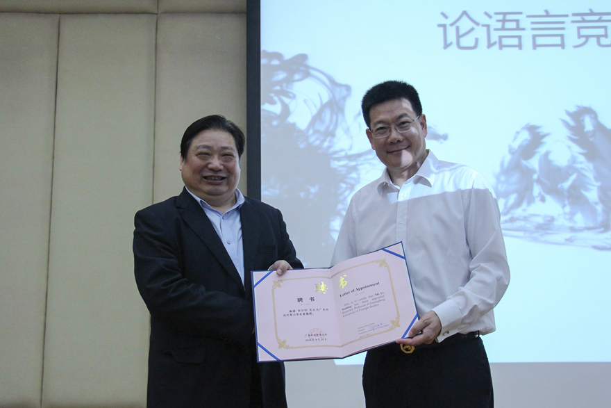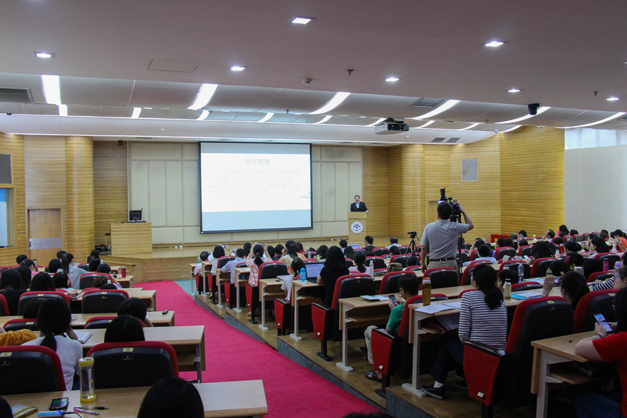 本网讯 4月28日,我校著名教授论坛第295讲在我校北校区图书馆报告厅开讲。北京语言大学党委书记李宇明以“论语言竞争”为题作了精彩报告。我校校长仲伟合,副校长陈林汉出席讲座,出席讲座的还有我校教授何自然、王初明、王桂珍等。讲座由我校翻译学院院长赵军峰主持。