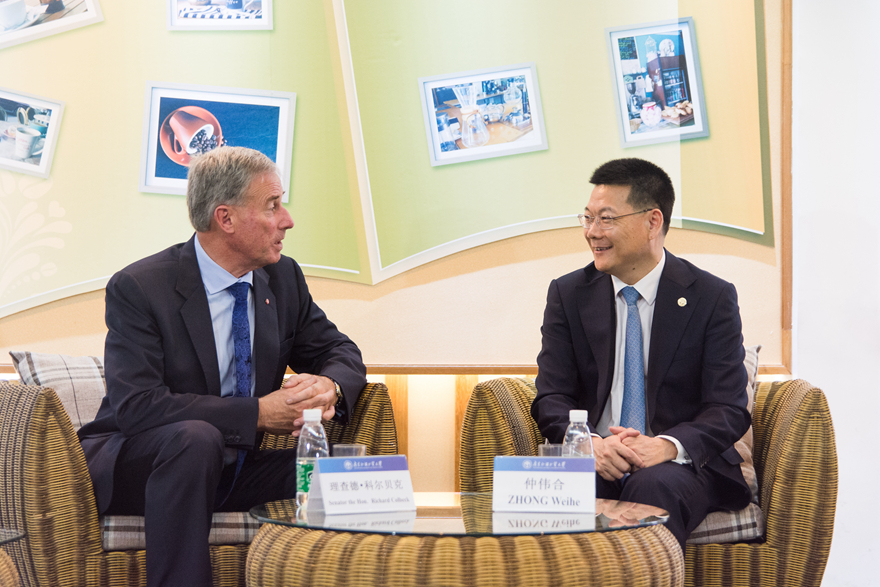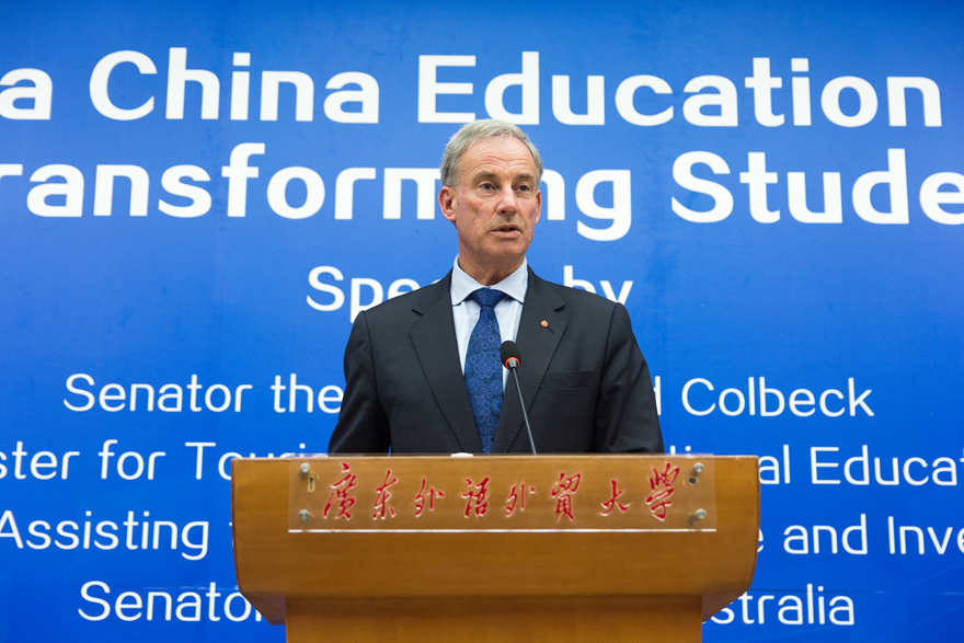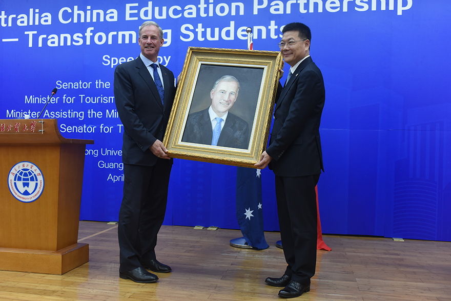 本网讯 4月15日,澳大利亚旅游及国际教育部长理查德·科尔贝尔(Richard Colbeck)一行在澳大利亚驻广州总领事馆总领事陪同下访问我校,在北校图书馆报告厅发表题为“澳中教育合作改变学生”的演讲。查德·科尔贝尔与我校校长仲伟合进行了会谈,并接受了《中国日报》等新闻媒体的采访。