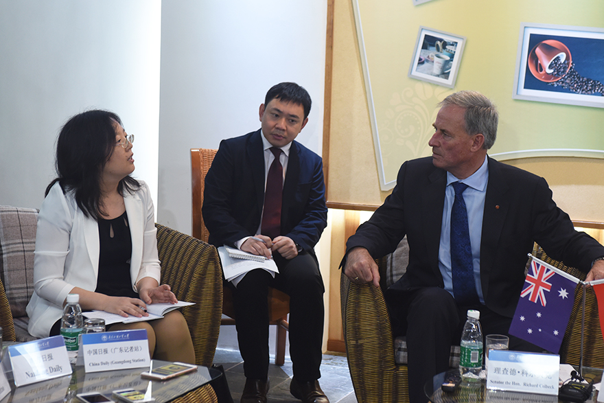 理查德·科尔贝尔谈到,澳中两国教育合作历史悠久,卓有成效,澳大利亚也高度重视澳中两国间业已建立的教育合作伙伴关系。据悉,中国已成为澳大利亚最大海外留学生来源国,已有超过20万中国留学生选择赴澳留学。针对留学生,澳大利亚拟推行首个国际教育战略,在教育质量提升的前提下,巩固国际教育的领先地位。他还表示,两国间的教育合作对加强人员交流、促进双方理解,建立更坚固的友谊具有重要的作用。理查德·科尔贝尔提到,中国是澳洲的重要贸易伙伴,在《中澳自由贸易协定》下,双方应加强经济互补性,促进贸易发展。而在旅游发展方面,澳洲每年接待超过一百万的中国游客,而中国文化对澳也有强大吸引力,这是双方在旅游业上的合作契机。最后他总结:人和人通过教育获得联系,因此,同处于经济转型期的澳中两国不仅要在经贸上加强合作,还要在旅游、教育方面增强合作交流,通过教育改变学生的人生发展轨迹,增强两国间的友谊。