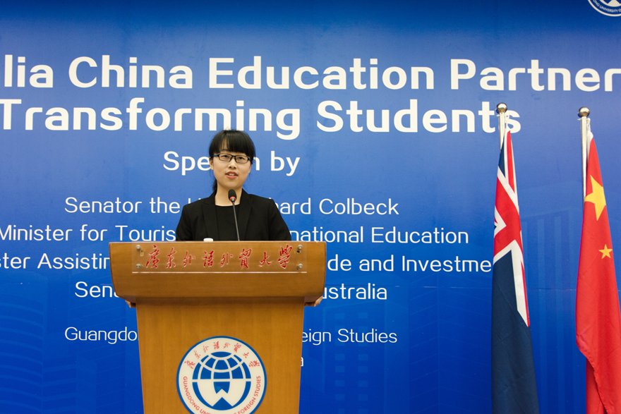 会上,我校国际商务英语学院的陶晓蕾作为学生代表发言。她从“多元”、“潜力”、“家庭”三个关键词出发,分享了她在澳洲昆士兰大学学习一年里的心得体会。