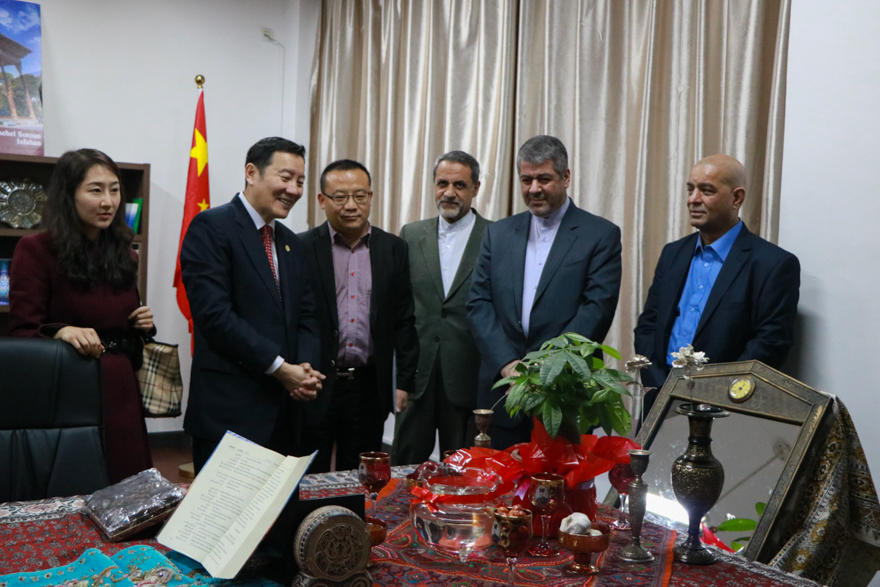 双方一同参与伊朗学中心剪彩仪式并参观该中心。新落户的伊朗学中心地面铺着华丽的波斯地毯,桌面上摆放着丰富的伊朗风味的新年宴席,书架里陈列着波斯文化的相关书籍文献。中心落户当天恰逢伊朗的“诺鲁兹”新年,大家欢聚一堂,品尝伊朗美食,享受这异域节日的别样风情。