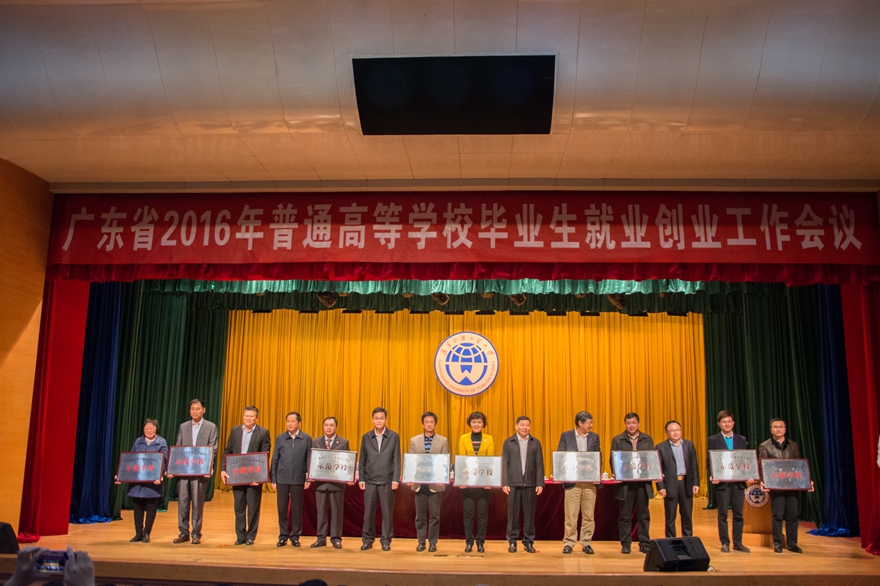 会上,广东技术师范学院、深圳大学等五所高校代表交流了工作经验。我校校长仲伟合代表高校与省教育厅签订了高校毕业生就业创业工作责任书。省领导为2015年大学生创新创业教育示范学校授牌,副校长刘海春代表我校上台领奖。