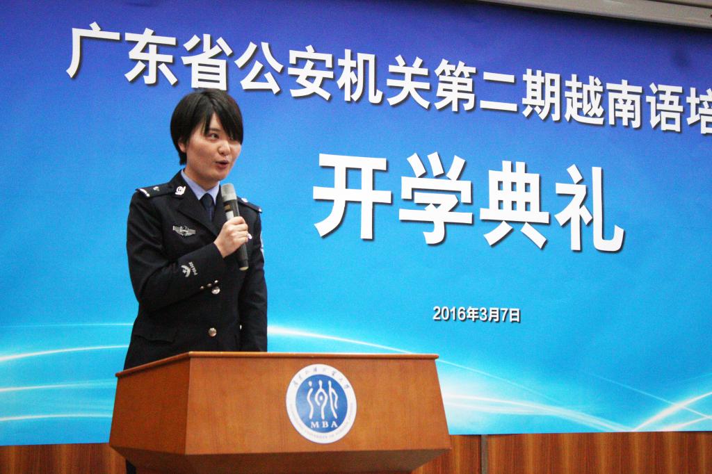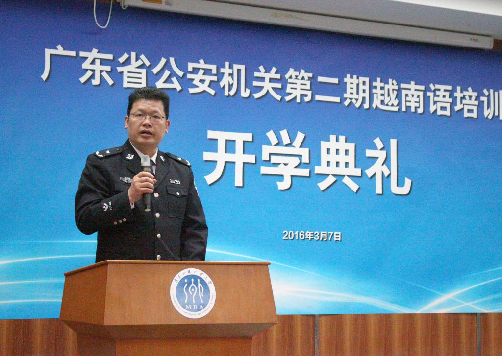 申勇强在讲话对此前我校与广东省公安厅合作开办的第一期越南语培训班表示肯定。随后通过列举具体数字及案例,说明当前越南“三非”(非法入境、非法居住、非法就业)人员的数量不断递增,越南语的学习和运用将对广东省的出入境管理工作起到非常重要的作用。他还向学员们提了三条建议,希望学员在培训期间能认真学习,遵守广外的规章制度,同时也谨记作为人民警察的相关纪律要求。