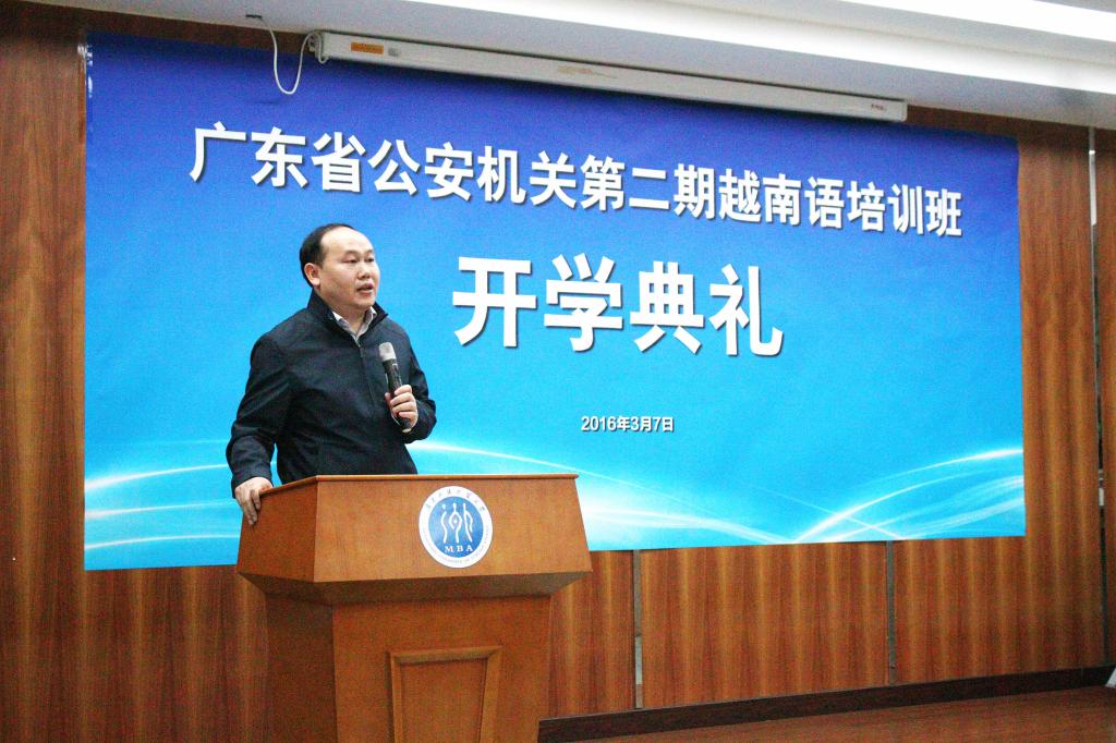 本网讯 3月7日,广东省公安机关第二期越南语培训班开班典礼在我校第九教学楼黄华讲堂举行。广东省公安厅出入境管理局政委申勇强、我校副校长阳爱民,东语学院院长陈多友、党委书记杨敏生,培训班学员以及越南语系全体师生出席了此次开班典礼,典礼由杨敏生主持。