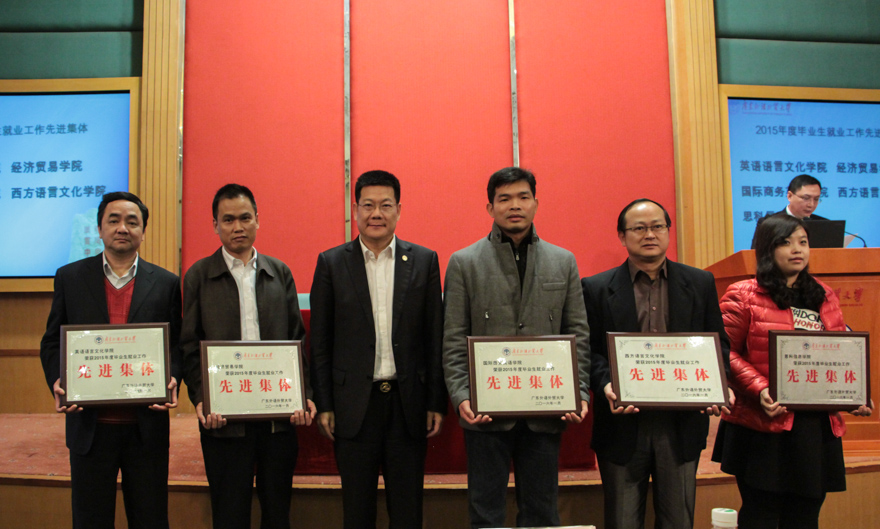 会议还对2015年度毕业生就业工作先进集体和个人进行了表彰。英语语言文化学院、经济贸易学院、国际商务英语学院、西方语言文化学院以及思科信息学院等5个学院获得了2015年度毕业生就业工作先进集体奖项;王斌、费俊慧等10位同志荣获了2015年度毕业生就业工作先进个人荣誉称号。
