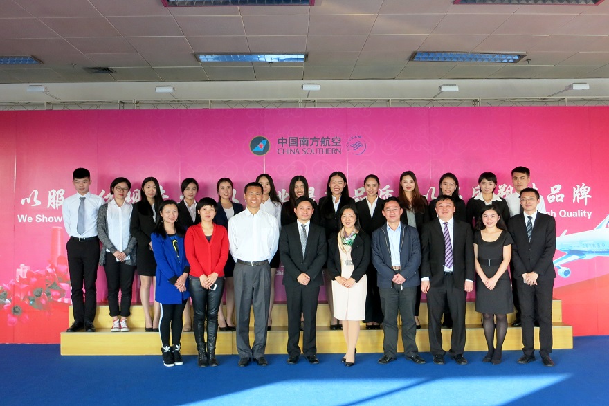 本网讯 近日,广东外语外贸大学-中国南方航空股份有限公司“民用航空管理与服务人才联合培养”项目首期学员开班仪式在南方航空公司培训中心举行。广外-南航“民用航空管理与服务人才”联合培养项目是我校与中国南方航空股份有限公司联合推出的优秀国际服务人才培养项目,该项目率先在业内搭建起“优秀航企+优秀外语类院校”合作培养优秀国际服务人才的平台。联合培养期间,校企双方将为学生提供量身定制的培训课程及丰富的岗位实习机会。联合培养生如顺利通过所有考核,毕业后可直接与南航签订正式劳动合同,从事民航服务工作。