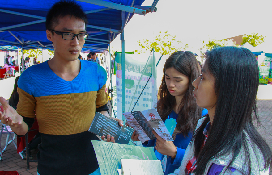 下午,2015广州青年创业社区文化节系列活动及广东大学生创业供需见面会在图书馆前的广场如火如荼的进行。上百个大学生创业项目展示,十余家创业服务机构、孵化器、投融资机构,直接和大学生进行项目洽谈,广东省人社厅、广州市人社局相关职能部门在现场提供政策咨询,数百名有创业意愿的大学生前来现场参观和咨询。