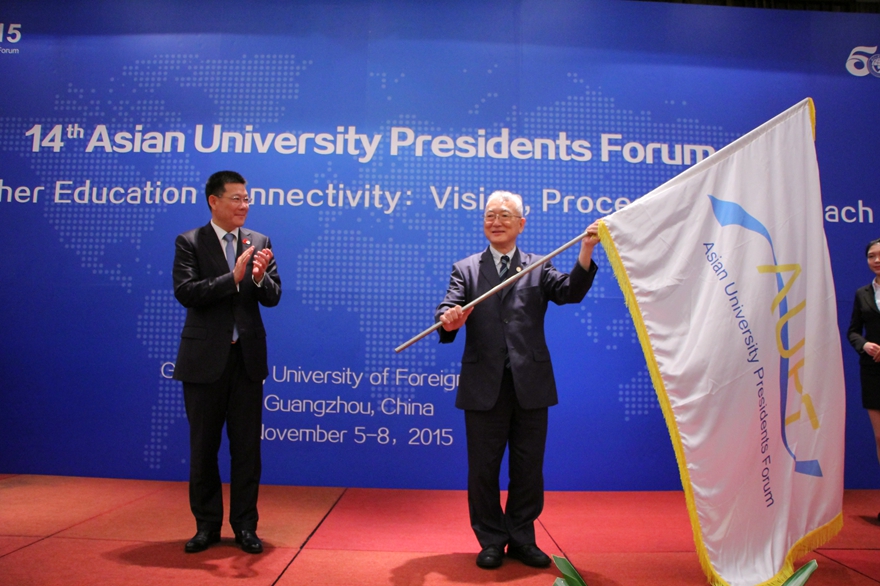 在仲伟合宣布本次论坛的结束之后,在场嘉宾观看了下一届论坛的主办方日本亚细亚大学的宣传片。随后举行了AUPF会旗交接仪式.仲伟合将AUPF会旗移交给日本亚细亚大学副校长Oshima Masakatsu。OshimaMasakatsu发表简短演讲,他对参加本次活动的大学校长、工作人员、志愿者等人表达了衷心的感谢,并对各亚洲大学校长发出参加下一届论坛的诚挚邀请。