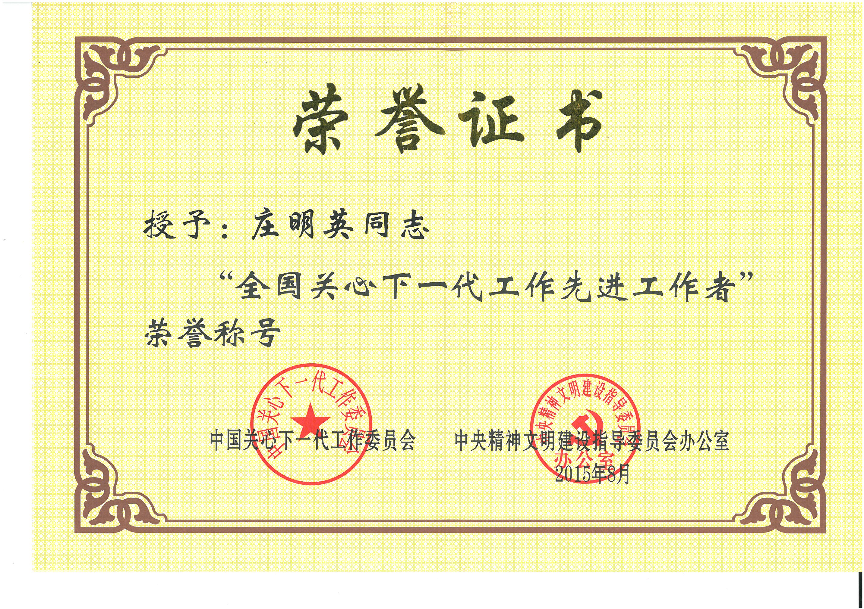 庄明英获“全国关心下一代工作先进工作者”奖状