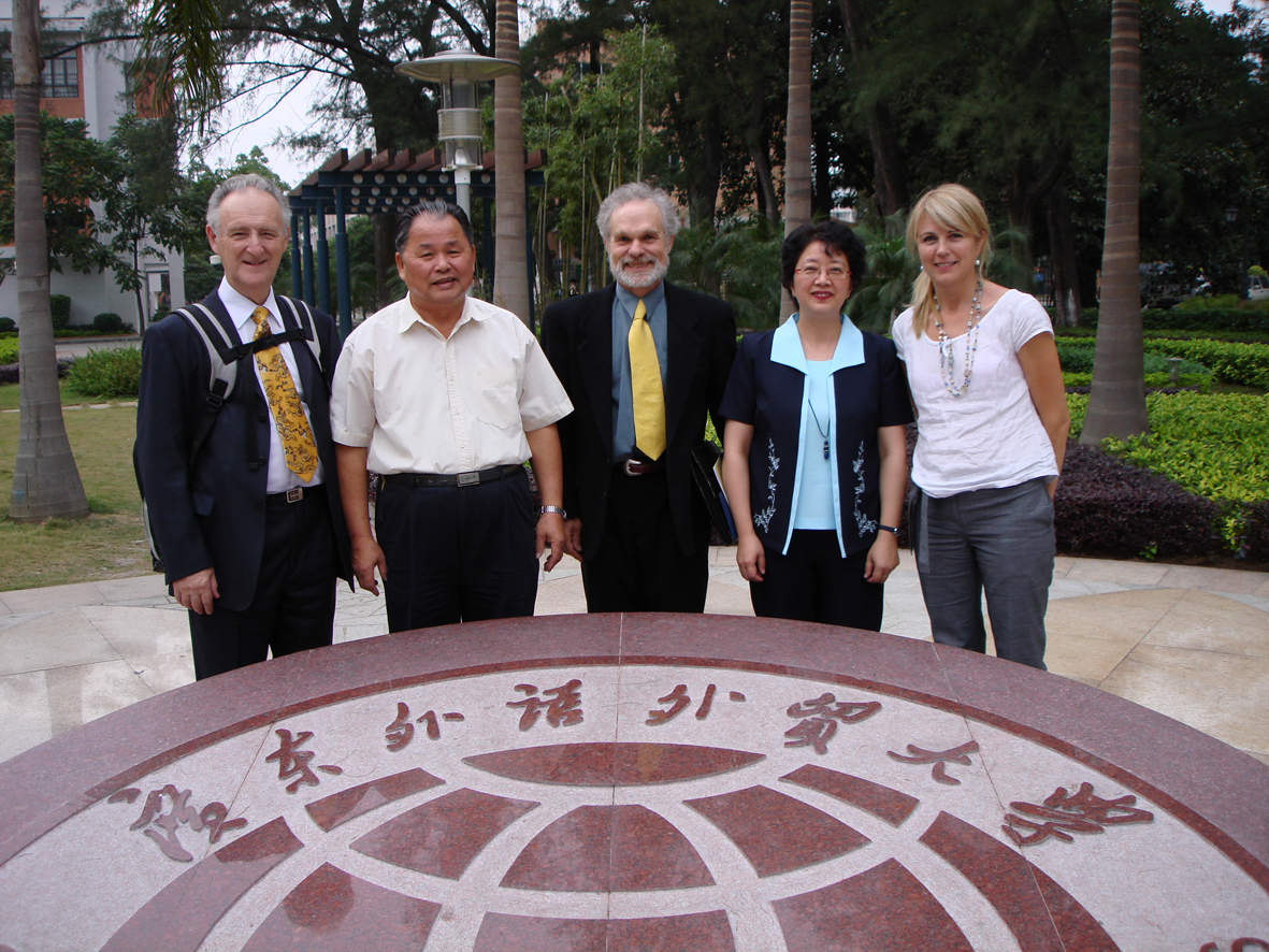 庄明英与来访嘉宾在校徽前合影(庄明英为图中左二)