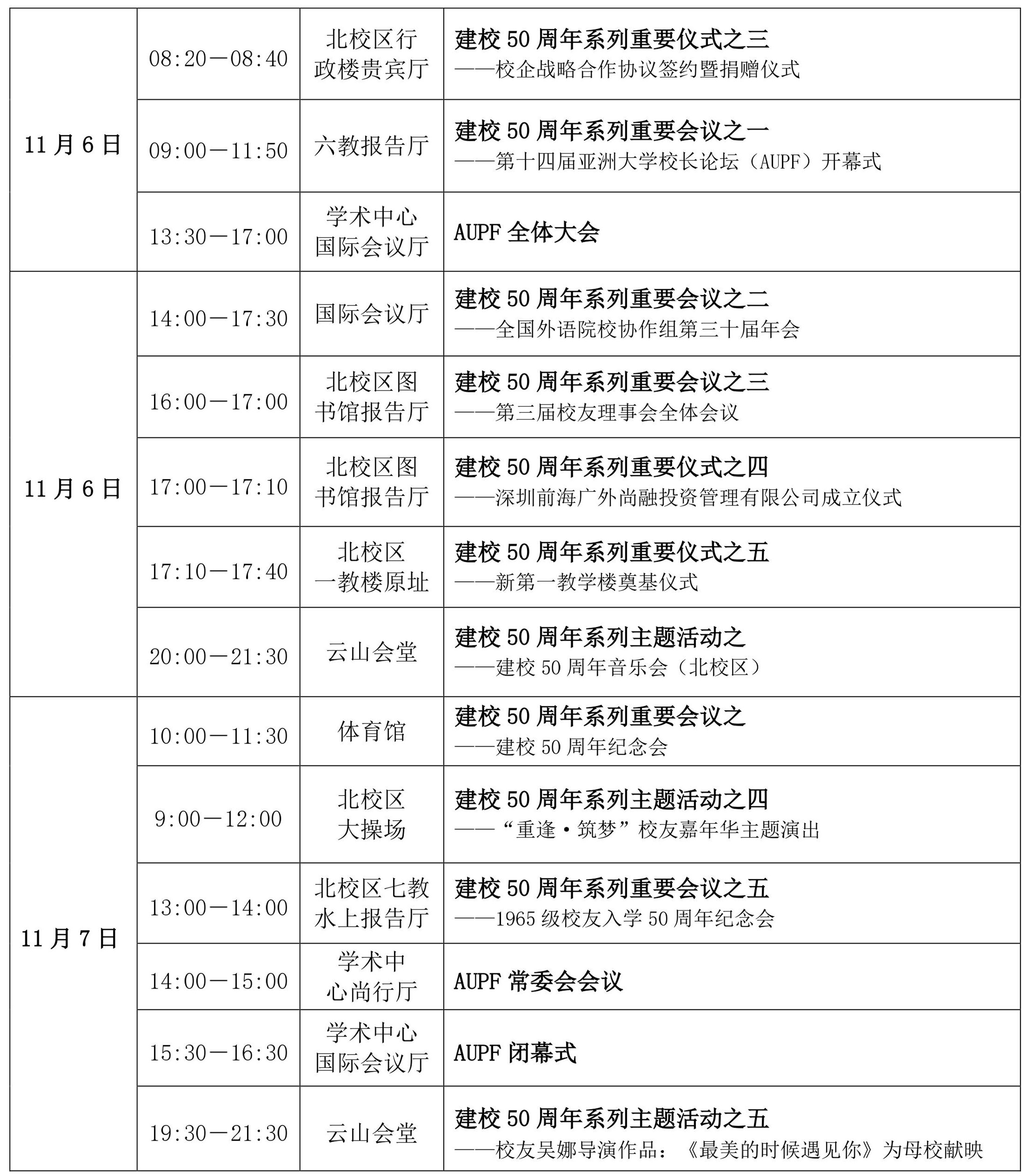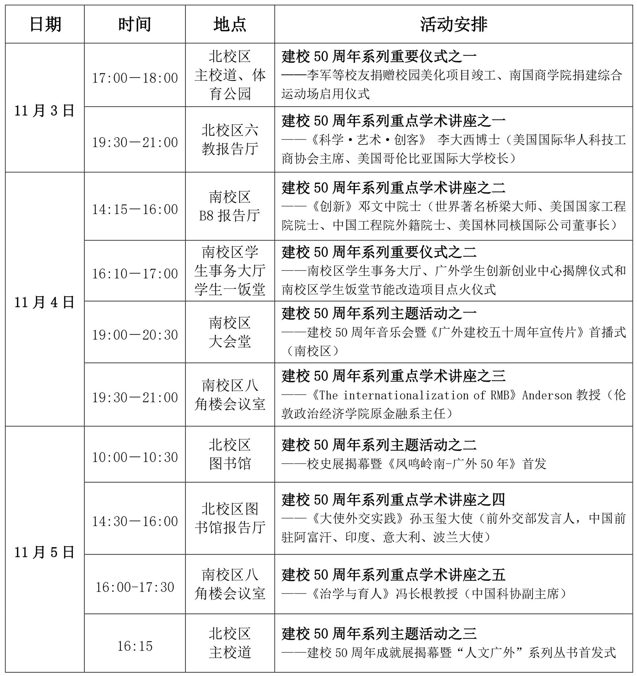 建校50周年,是学校发展历程的重要里程碑,也是学校总结历史、发展当下、谋划未来的重要节点。随着建校50周年系列活动逐渐进入高潮阶段,学校将本着庄重热烈、简朴务实的原则,突出“学术”和“校友”两大特色,在11月3日至11月7日期间,举办系列主题鲜明、内容丰富、形式多样的纪念活动,欢迎各位来宾莅校指导、各兄弟院校领导来校交流以及海内外校友“回家”团聚。
