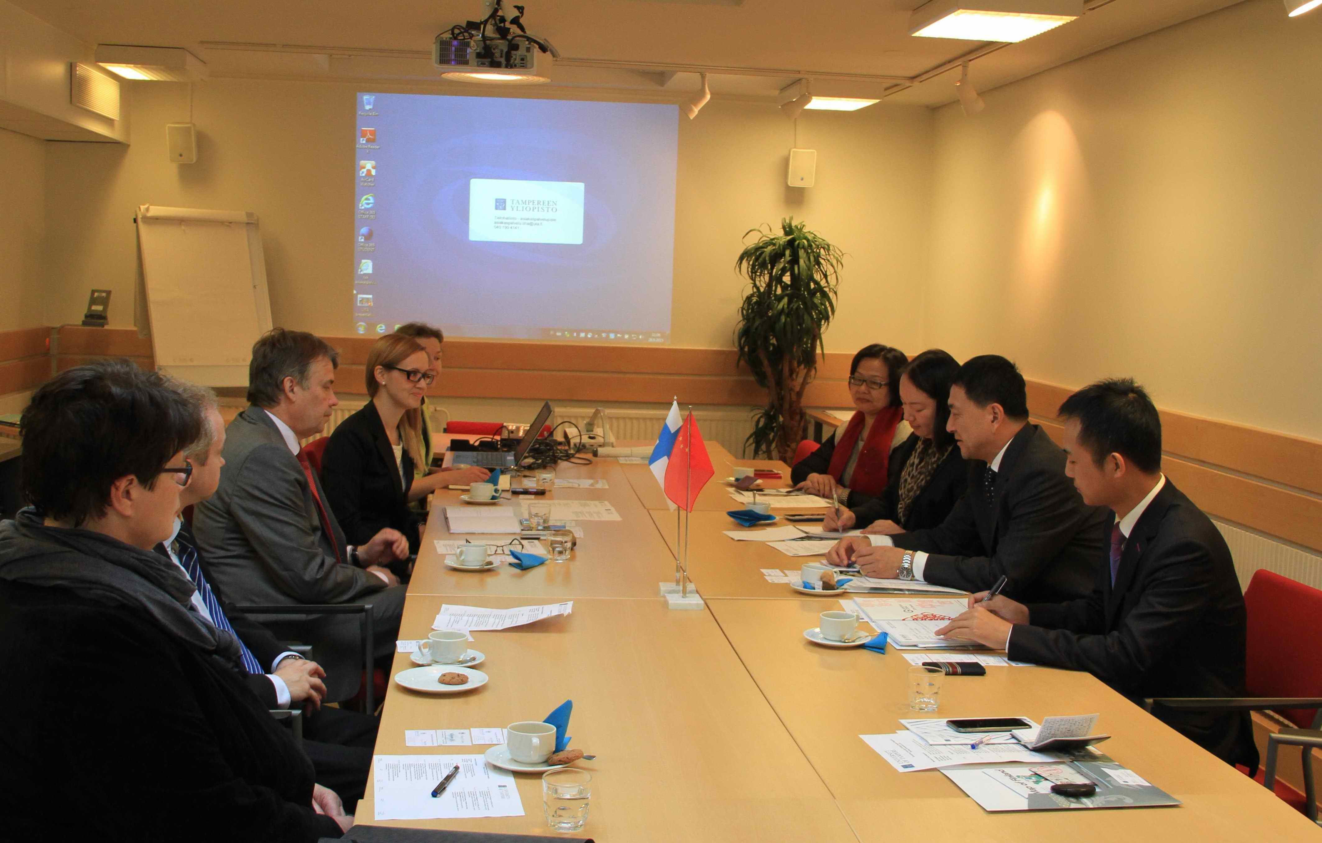 9月28日,隋广军一行访问了芬兰坦佩雷大学,拜会了该校外事副校长哈里·梅林,该校国际教育中心主任卡伊萨·库尔琪、语言翻译与文学学院副院长派维·帕塔、教育学院院长里斯托·洪可能、管理学院法学教授尤卡·威尔贾能等一同参加了座谈。双方回顾了2013年两校签署合作协议以来的发展情况,希望加强在语言文化、管理、教育等学科的深度交流,促进双方学生交流、教师培训等方面的合作。双方还就开展大学教育改革,提高学校的办学水平等进行了交流。
