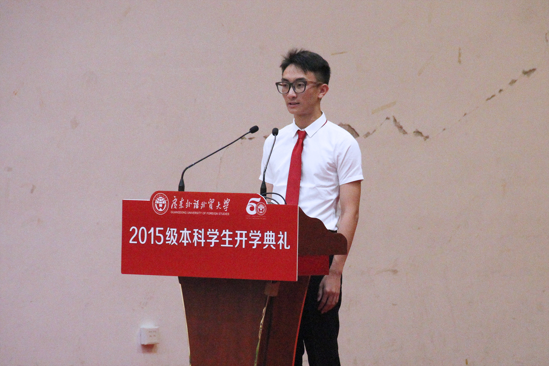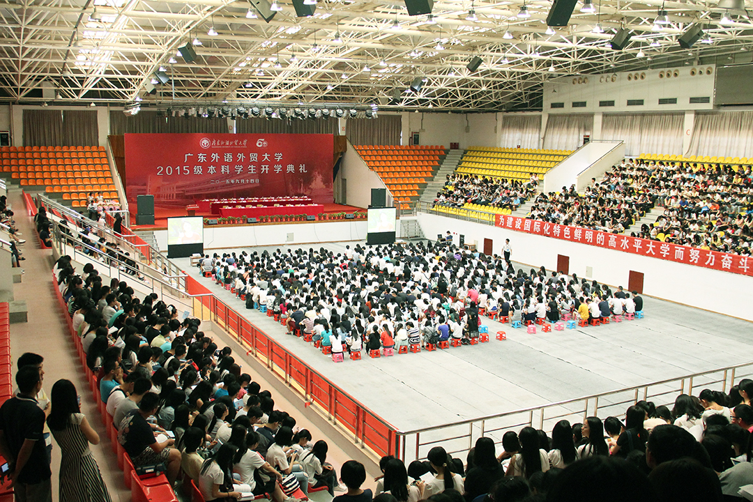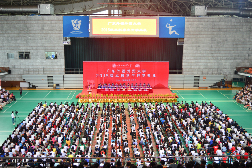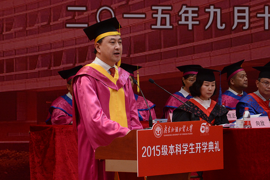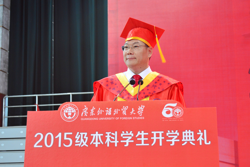 开学典礼上,隋广军首先代表全校师生向新同学们表示欢迎,欢迎他们成为广外人。回顾50载建校历史,他概括“广外是一所有底蕴、有特色、有担当的大学”:有底蕴,这个底蕴就是历史厚重,文化润泽;有特色,这个特色就是放眼全球、融通中西;有担当,这份担当就是勇挑重任、服务社会。这内在地决定了广外学子所应秉持的基本价值理念,至少应该包括卓越、诚信、包容和自信:卓越是追求,是对一流业绩的积极向往;诚信是根本,是为人做事的准则;包容是胸怀,是一种乐观面对人生的态度和智慧;自信是支柱,是直面挑战时的果敢和从容。他表示,广外正在致力于建设国际化特色鲜明的高水平大学,2015级新生必将成为见证者、参与者和受益者,创造广外更辉煌的下一个50年。他对新生提出了三点希望和要求:坚定信念,立足时代,立志成才;承担责任,心系国家,乐于奉献;勇于创新,独立思考,点燃创造的激情。
