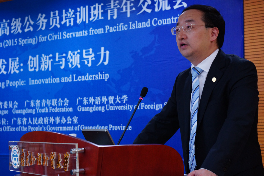 仲伟合用英文致辞。他指出,选择“青年的发展:创新与领导力”的主题开展交流恰逢其时,创新与领导力是一个国家发展的重要推动力,创新催生变革而领导力则能保证目标的坚定实现。他特别提到,广外即将实施的完全学分制就是创新的一大体现。他还提及我校新成立的“广东太平洋岛国战略研究中心”,希望藉此开拓我校与太平洋岛国全面交流的新局面。
