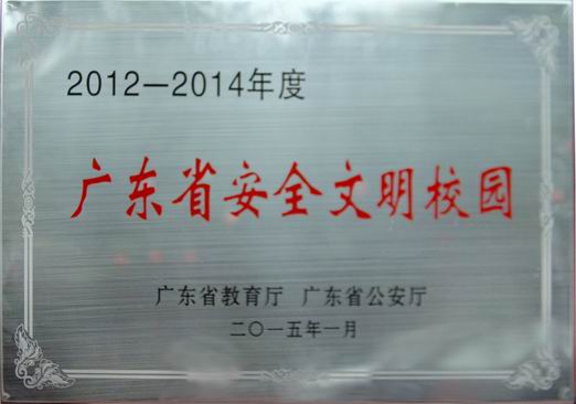 本网讯 近日,广东省教育厅、广东省公安厅联合下发了《广东省教育厅 广东省公安厅关于公布2012-2014年度广东省普通高等学校“平安校园”创建考评情况的通知》(粤教保【2015】1号),我校被评为2012—2014年度广东省高等学校创建“平安校园”优秀学校,并获得两厅联合颁发的“广东省安全文明校园”牌匾。
