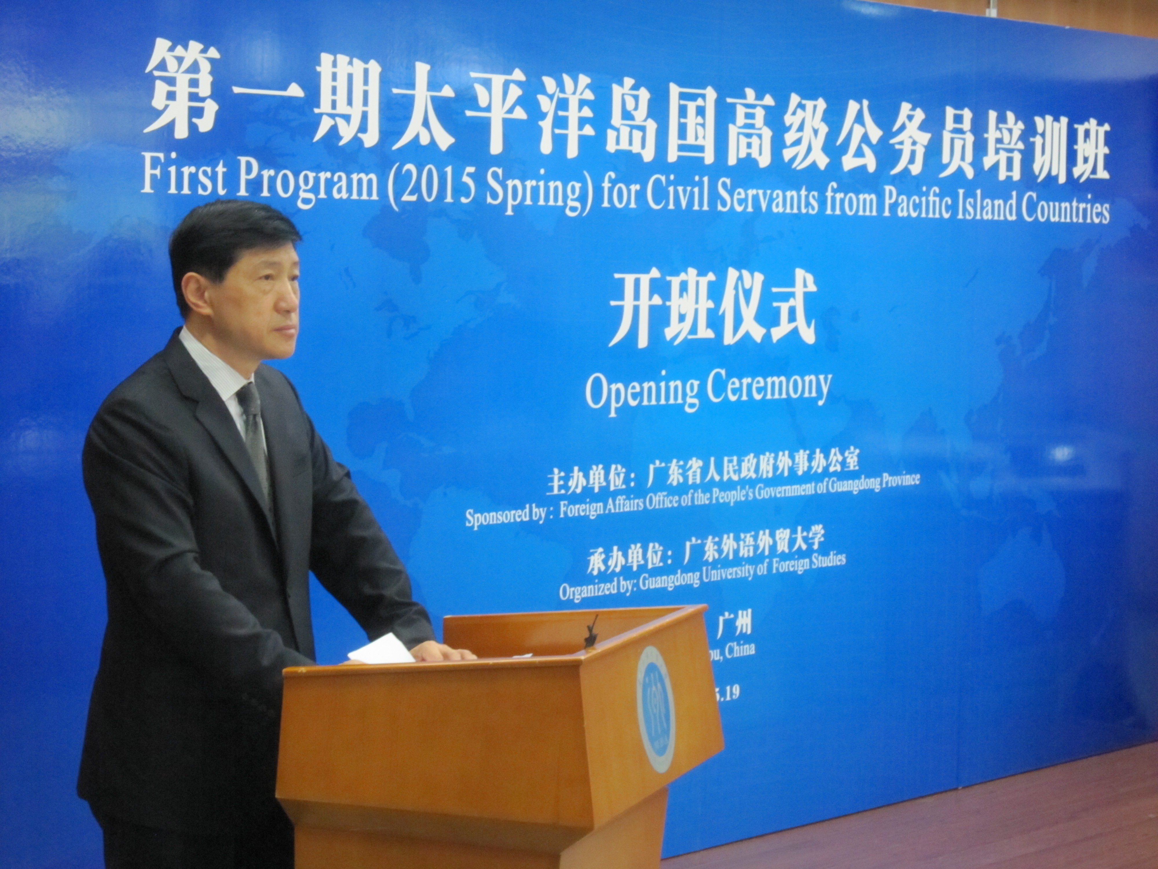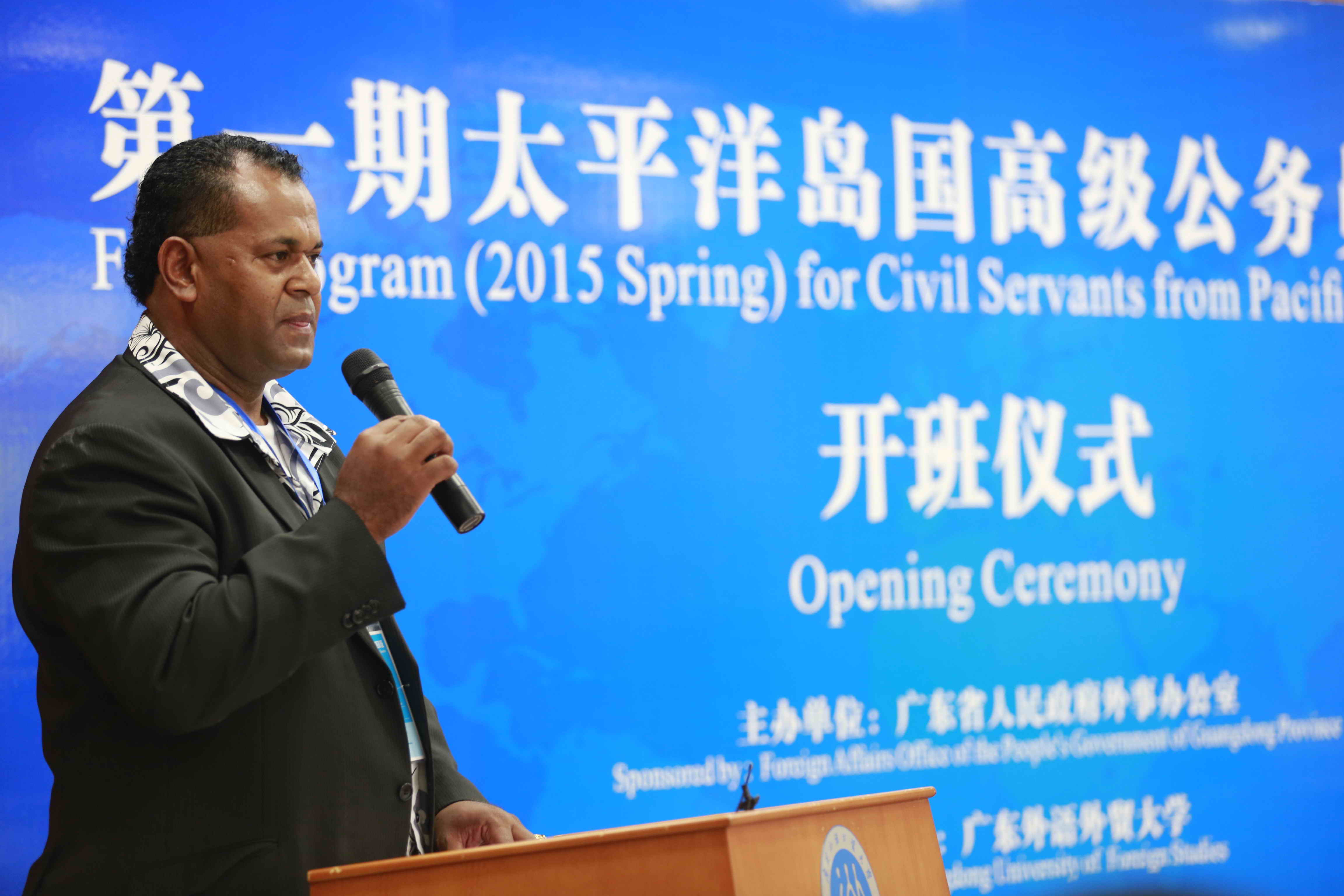 傅朗主任首先代表省外办致辞。对首批24名来自斐济、萨摩亚、汤加和密克罗尼西亚的高级公务员表示热烈欢迎,他对我校富有成效的承办工作表示感谢。他指出本月底广东省领导将率团赴该地区的岛国访问,进一步推动广东与各国在各领域的务实合作,此次培训班的举办可谓恰逢其时。他鼓励学员共同为中国今后与太平洋岛国开展务实共赢合作打下坚实的基础,在两国两地人民心间播下友谊的种子。当傅朗特别提出由广州飞往斐济的直航即将开通时,全体学员爆发出热烈的掌声。