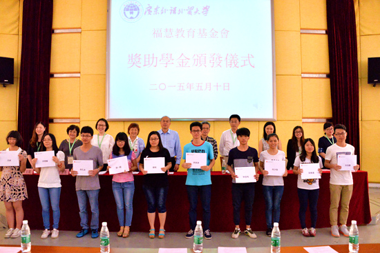 本网讯 5月10日,2014-2015年度福慧奖助学金发放仪式于广外南校区八角楼会议室启动。福慧教育基金会主席关保卫、会长黄绮铢和我校党委副书记卢景辉等人出席仪式。仪式上共有129名广外学子获得由福慧教育基金会捐助的共26.3万元奖助学金。