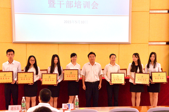 本网讯 5月10日下午,云山勤工2015年表彰大会暨干部培训会在南校区八角楼会议室召开。学生处的领导和老师、云山勤工管理层及优秀员工代表出席会议。会议上,学生处处长谢应东等为云山勤工助学的学生代表颁发表彰证书。