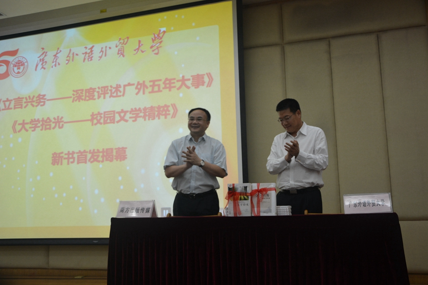 首发式上,党委宣传部部长胡文涛简要介绍了《立言兴务——深度评述广外五年大事》和《大学拾光——校园文学精粹》两书的基本内容。广东人民出版社社长曾莹对丛书首发致贺词,她表示两册图书意义非凡,传播了正能量,是广外精神的集中体现。