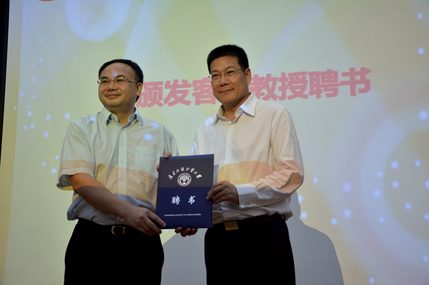 王桂科与仲伟合在现场师生的见证下签署了《南方出版传媒股份有限公司与广外合作备忘录》,此举为拓展双方进一步合作打下了坚实的基础。签署仪式后,学校为王桂科举行客座教授续聘仪式,仲伟合向王桂科颁发了客座教授聘书。