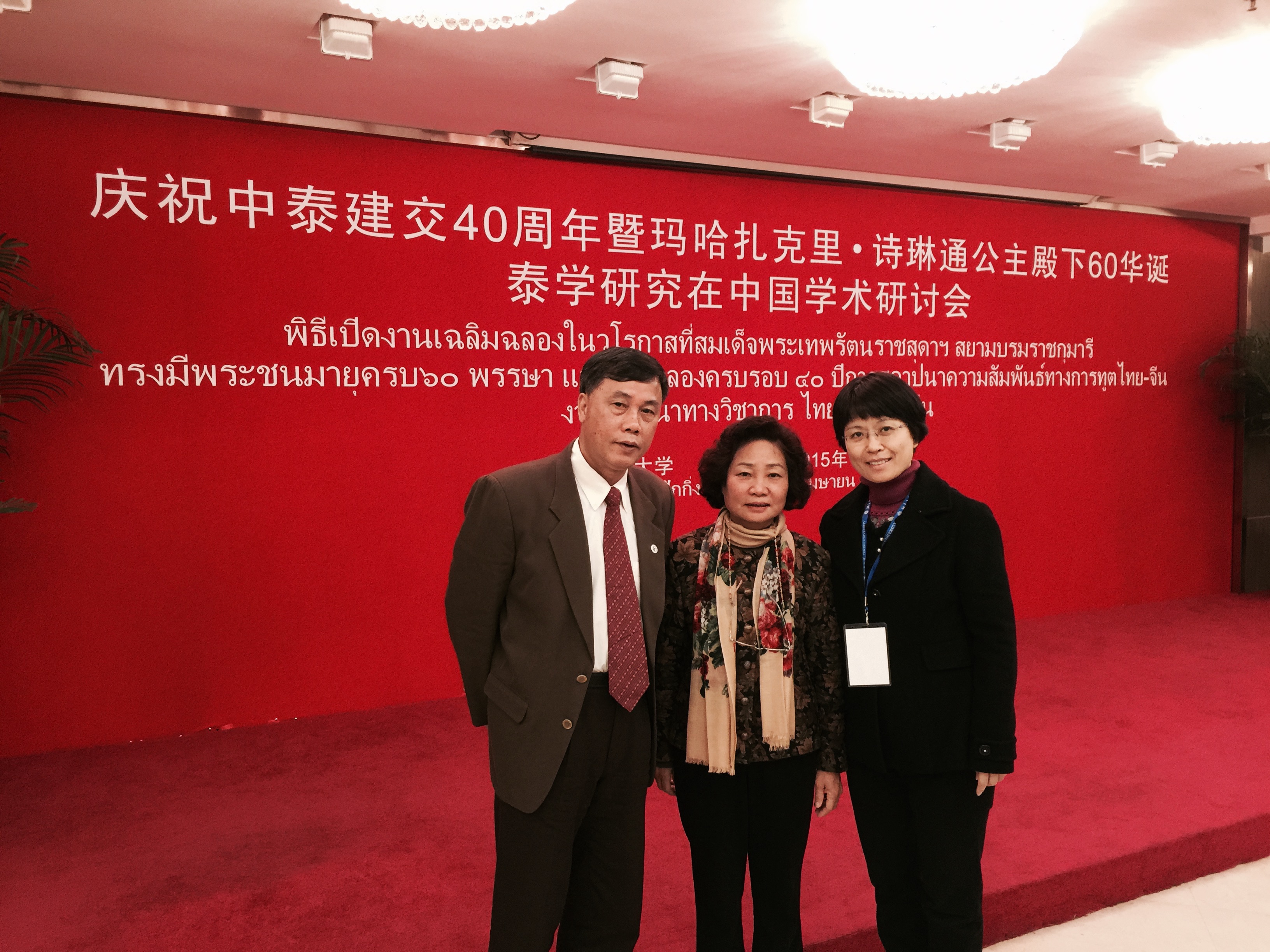 本网讯 4月4日至5日,为庆祝中泰建交40周年暨诗琳通公主60华诞,“泰学研究在中国”学术研讨会在北京大学举行。我校泰语系教授林秀梅、黄进炎和吴圣杨参加会议,并代表我校向诗琳通公主赠送贺礼。