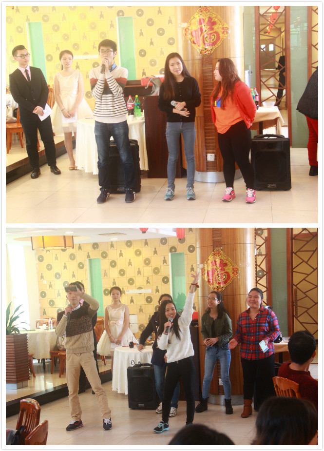 席间,同学们还献上趣味盎然的娱乐节目,为团年饭增添浓浓的喜庆。学生向方月等为大家表演了歌曲串烧,金东炫等来自韩国、印度尼西亚、蒙古国的留学生代表演绎了自己祖国的歌曲,将欢庆的节日气氛推向了高潮。整个会场欢声笑语、春意盎然。来自韩国的金东炫说,这是他第二次留在学校过年了,学校每年举行的团年饭让他感受到浓浓的节日气氛,广外就是他的家。