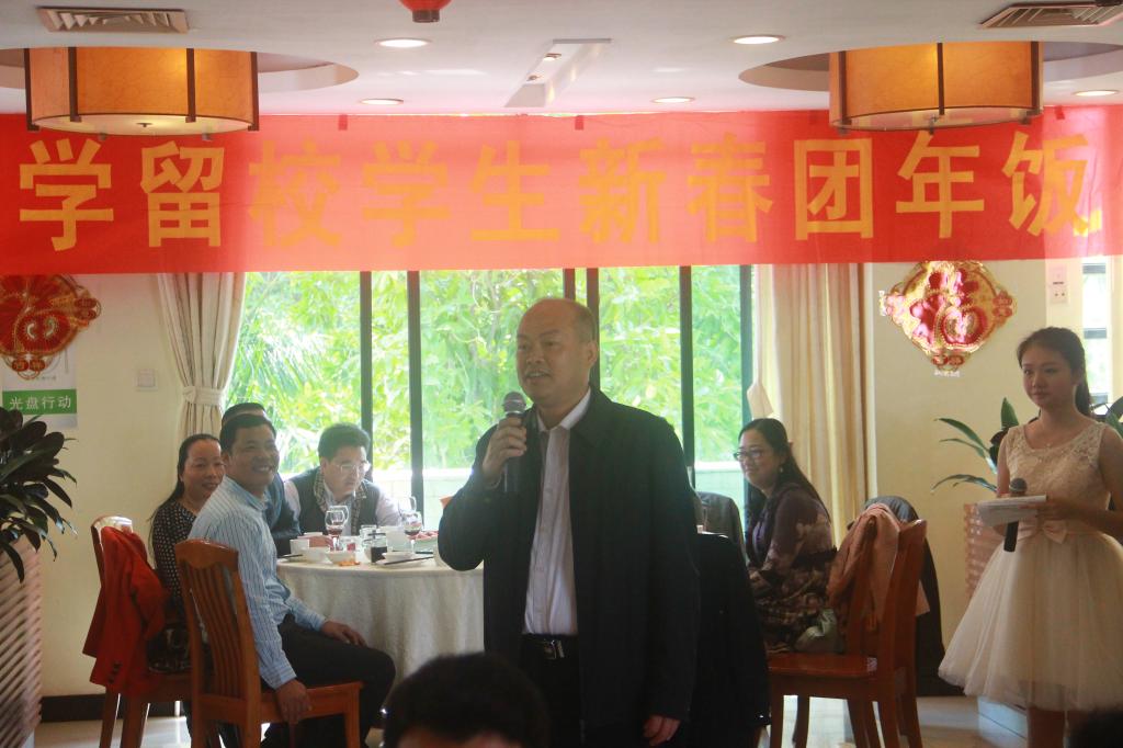 团年饭上,卢景辉首先转达了校党委书记隋广军和校长仲伟合对同学们的节日问候。他说,回首2014年,学校在奋进中成绩显著,这离不开师生们的共同努力。2015年学校喜迎五十华诞,希望大家继续齐心协力,同心同德,奋发有为,加快推进国际化特色鲜明的高水平大学建设,为建校五十周年奉献新的精彩。卢景辉还代表学校为留校学生派发新年利是,希望大家在学校也能像在家一样过一个祥和、温暖的春节。