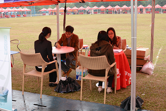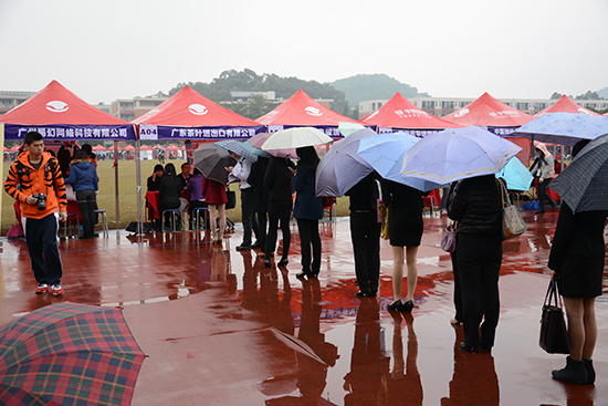 本网讯 12月7日,毛毛细雨加剧了广州冬季的寒冷,但北校操场入口仍早早地排起了穿着正装、拿着简历的毕业生应聘者的长队。广东省2015届高校毕业生就业供需见面会(外语外贸、涉外法、管理类专场)在我校北校区田径场拉开帷幕。来自各大高校的2000余名毕业生角逐珠三角地区的185家用人单位提供的3800多个岗位。我校党委副书记卢景辉冒着雨到招聘会现场,询问毕业生面试情况,为面试者加油打气。