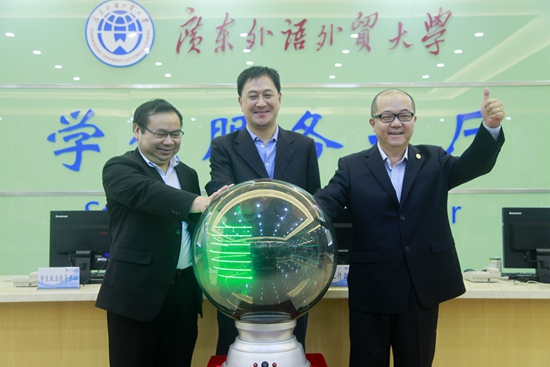 本网讯 2015年11月7日,广外将迎来建校50周年。在距学校50华诞一周年之际,我校在刚启用北校区学生服务大厅举行了建校50周年倒计时一周年活动。建校50周年专题网站、新浪微博和腾讯微信平台于同日上线,校庆主题词“DREAM——重逢•筑梦(Delightful Reunion: Embrace Another Miracle)”也在活动上正式公布。
