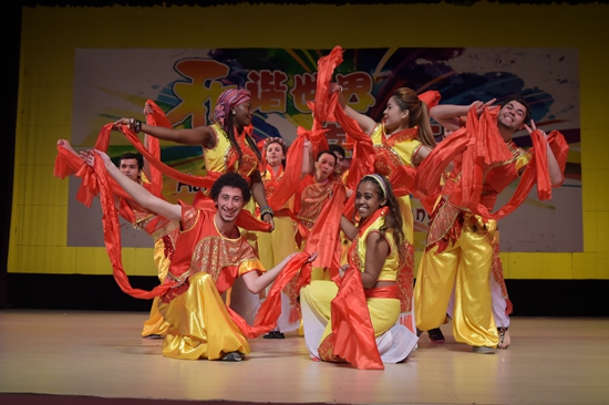 广袤园武术协会带来了精彩的武术表演——《精武风云》。随着武者们上场,舞台上旗帜飞扬、刀光剑影、舞枪弄棒,在雄厚的吼声中打出一套套精彩纷呈的拳法,可谓酣畅淋漓。在一招一式中尽显英雄本色,也将中国的传统武术展现给了现场的中外观众。来自瑞士、刚果、几内亚、阿塞拜疆等国家的7位同学表演了小品《笑傲招聘》。在表演之中融合了大量的中国元素,将《鹿鼎记》、《笑傲江湖》、《倩女幽魂》、《水浒传》等名著中的典故化为今用,扮演面试官的瑞士男生Geff还使用了“有木有”、“hold住”、“喜当爹”等网络新语,使现场观众欢笑连连。