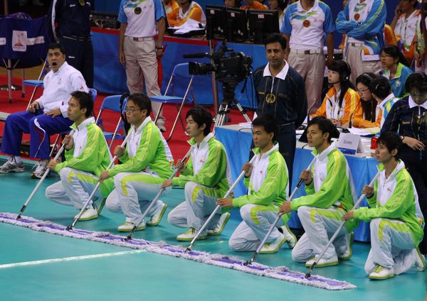 竞赛处是服务赛事最忙碌的部门之一,它主要负责比赛的相关事宜,起着重要的协调作用。在竞赛处工作的体育部教师朱性民介绍说,为了首场比赛的顺利进行,竞赛处的老师们当天都要提前一个多小时来到场馆做准备工作。场地器材设备处则是“切切实实的体力活”,那些志愿者要摆放好比赛所需的桌椅和器材,负责比赛前后的场地清洁工作。比赛时要协助裁判长工作,结束后还要用大概1个小时的时间来完成收场工作。就以在女排赛场上拖地的工作来说吧。一到比赛的暂停时间,身扛拖把的志愿者需要立即行动,“并驾齐驱”地冲进赛场、步调一致地放下拖把,用同一节奏开始拖地、转身,完成后再退回一边,整个过程一气呵成,绝不拖泥带水。那架势,那速度,那步伐,绝对是训练有素。因为如果有一个地方没有打扫干净,那么选手就会受到影响,比赛的结果就会被改写。