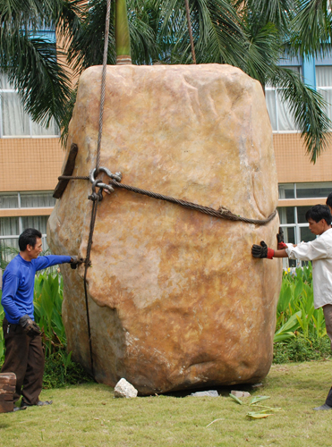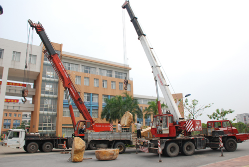 据党办、校办副主任谢伟光介绍,这批石材是由校办负责专门从英德定购回来的。其中最大的一块黄蜡石重达21吨,将作为我校南校区的校训石,与北校区校训石相呼应。因此对其材质、形状和大小等要求较高,物色了较长的时间才找到。该石头将被放置在教学楼A栋门前的草坪上,正好处于教学区和行政区的交叉点,人流量大,非常引人注目。校训镂刻工作将于近期完成,以便大学城2千多名第一届毕业生拍照留念。校训不仅是我校师生的座右铭,还是我校的文化名片之一。