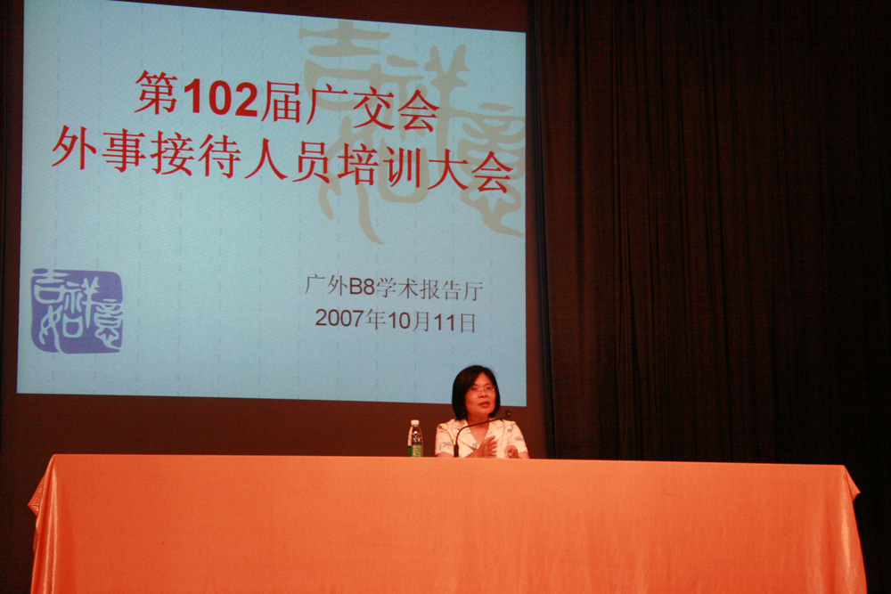 本网讯 2007年10月11日上午九点半,第102届广交会外事接待人员培训大会在广外B8报告厅隆重召开,到场的嘉宾有中国进出口商品交易会外联处处长、外事办副主任彭巧玲女士,外联处副科长吴子光,对外经济贸易大学赵凤琴,商英学院党总支副书记谢应东,广东外语外贸大学经贸学院党总支副书记康为茂等。培训会同时在教学楼E204进行了现场直播,两个会场总共有六百多人参加了这次培训。