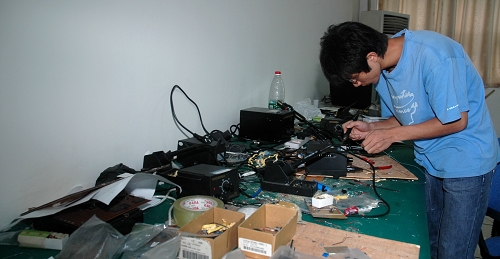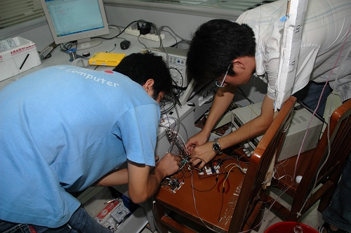 培训期间最辛苦的莫过于学院的模拟竞赛。指导老师们要通过这次模拟竞赛最终确定参赛队员的名单。为了取得参赛资格,实验室里所有的小组成员都拼了命地工作,时间是五天四夜。这几天队员们忙得焦头烂额:设计电路原理图,买元器件,焊接电路,编写程序,调试电路,撰写文档。其中最花时间与精力的是调试电路板这一环节。有些电路需要经过无数次地调试才能通过测试,有些电路甚至无论怎么调试都无法工作,这时就需要重新选择解决方案,再设计电路原理图。这是需要有足够的耐心与毅力。而实验室里的同学最具备的基本素质应该说就是这两项,所以一般都能够坚持不懈地把电路板调试成功。罗彬同学说,记得期间一天我晚上十点钟才打开饭盒,而饭盒是傍晚五点多就送来的。