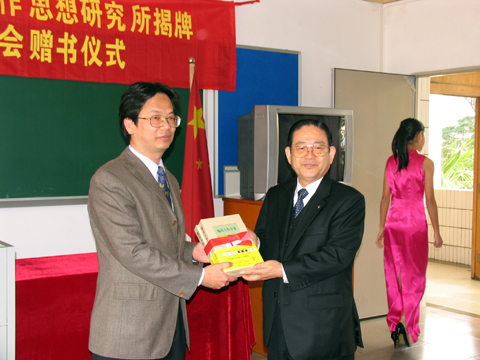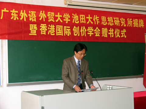 本网讯 2009年1月6日下午,广东外语外贸大学池田大作思想研究所揭牌暨香港国际创价学会赠书仪式在东语学院会议室隆重开幕。校党委副书记陈建平,香港国际创价学会理事长李刚寿,广州市人民对外友好协会秘书长刘荣华,日本国驻广州总领事馆首席领事濑野清水,东语学院院长、池田大作研究所所长韦立新,东语学院党委书记林绍雄等出席了仪式。开幕仪式由东语学院副院长陈多友主持。