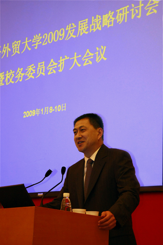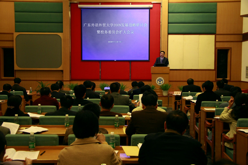 本网讯 1月8日上午,我校“发展战略研讨会暨校务委员会扩大会议” 在北校区国际会议厅举行。校长隋广军作《明确发展方向 推动科学发展 开创建设高水平教学研究型大学的新局面》的主题发言,副校长仲伟合作《广东外语外贸大学财经学院成立后部分学科专业调整方案》(征求意见稿)的发言。校党委书记徐真华等全体校领导以及校务委员、各教学单位党政负责人、各科研、教辅、机关单位主要负责人出席了会议。会议由副校长方凡泉主持。