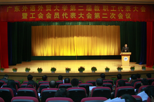 本网讯 1月7日,我校第二届“双代会”第二次会议在北校区六教报告厅召开。代表们听取审议了由校长隋广军作的学校工作报告和由校党委副书记、教代会常委会主任、校工会主席陈建平作的教代会工会工作报告,审议了《广东外语外贸大学非事业编制教职工入会暂行规定(草)》和《广东外语外贸大学教职工救助基金管理办法(草)》。会议为期一天,上下午会议分别由副校长刘建达和校党委副书记许国彬主持。