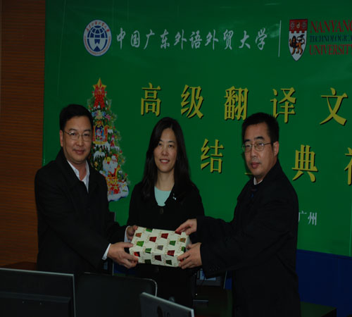 学员代表马荣毅满怀深情地表达了他们两个月来的感受和心声。学员们在广外这个温暖的大家庭里充分感受了师生员工对他们无微不至的关怀,领略了高翻学院老师们的风采和学生们的才华,还充分享受了广州的美食。在短短的两个月的时间里他们已经对广州对广外对高翻产生了深厚的感情,在离别之际,他们对这个给他们留下了美好回忆的地方依依不舍,最后,他们还把他们的深厚感情融入到每一份礼物中送到了教师们的手中。