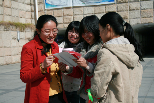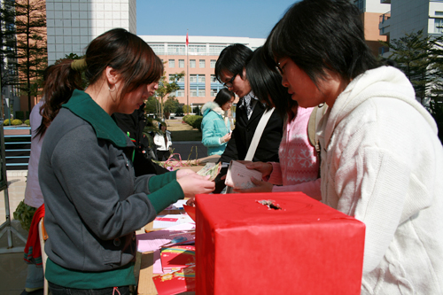 本网讯 12月24日上午,新长城5.12地震灾区学生新春关爱行动在南校区开展,四个贺卡义卖点分居教学楼A座过道、隧道口、一饭门前和又康超市门前校道,“寄一封贺卡,送一份祝福”的宣传标语为寒冬凭添暖色。据我校自强社统计,24日南校共义卖贺卡1190份,筹得资金12350元。活动结束后,自强社办公室和云山水榭咖啡屋还会有定点义卖。