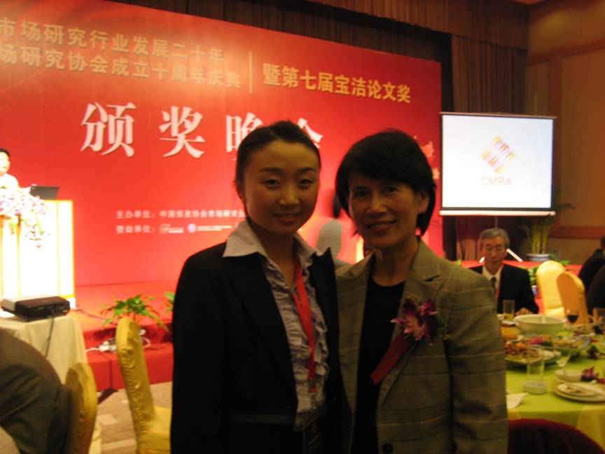 周璐应邀参加了12月11日—12日在北京香山饭店举行的第三届营销实践与市场研究应用峰会暨第七届“宝洁”论文奖颁奖晚会。市场研究协会会长、中国传媒大学教授柯惠新,宝洁公司市场研究部副总监谢阳清女士向获奖学生颁发证书。会上,周璐作了约10分钟的演讲,向到场的所有嘉宾介绍获奖论文,受到专家的一致好评。
