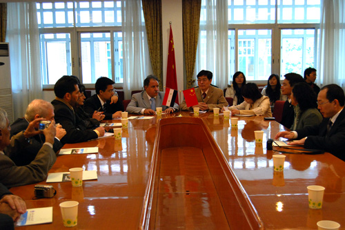 哈莱夫高度评价我校在党建、办学方面取得的成绩,并介绍了叙利亚教育办学方面的发展状况。他指出,为了适应社会发展,叙利亚国立大学数量由70年代的2所增加到目前的6所,除此之外,还建立了一所虚拟大学,进行远程教育,以便与国外的大学进行交流。哈莱夫强调说,目前叙利亚的官方大学推行的是免费教育,平均每班24人,学生受教育条件良好。另外,学校每年都会举办夏令营,让学生接触社会、锻炼实践能力。最后,他表达了和我校建立合作关系的希望。