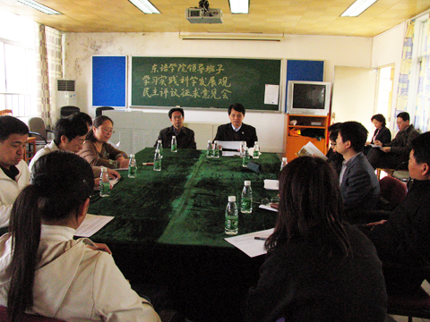 本网讯 12月11日下午14:00,东语学院在一教四楼会议室召开了“东语学院领导班子学习实践科学发展观查找问题恳谈会暨民主评议征求意见会”。会议由学院党委书记林绍雄主持,院长韦立新、党委副书记郝建萍和教工代表出席。与会人员各抒己见,畅所欲言,就学院的学科建设、教学管理、学生工作、学院文化活动等方面的科学发展问题展开了热烈的讨论交流,提出了不少关键而切合实际的意见和建议。
