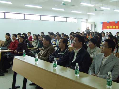 蒙德红在致辞中代表学院党委和全体师生对黄花中学的师生表示热烈欢迎。他说道,今年是广外大与英德市黄花镇合作建设大学生社会实践基地的10周年,感谢黄花镇镇委,镇中学和全体百姓对学院的“三下乡”工作的大力支持。在他们的支持下,该院下乡工作办得有声有色,与黄花镇合作建设的基地也被评为校优秀下乡基地。蒙德红还特别提到我校是广东省学习实践科学发展观的试点单位。最后,蒙德红表示,希望在座的学生经过这一天对大学生生活的体会,树立刻苦学习的精神。