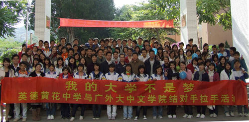 本网讯 12月6日,英德市黄花中学领导和45名学生代表来到我校,在六教213与中文学院志愿者开展了“我的大学不是梦”结队手拉手活动座谈会。出席本次活动的有中文学院党委书记蒙德红、副书记周秀娇、团委书记刘勇。英德市黄花镇副镇长李洋海、黄花中学副校长彭路明、梁振列和黎传周、团委书记张廷琳和初三级级长周水清也出席了座谈会。