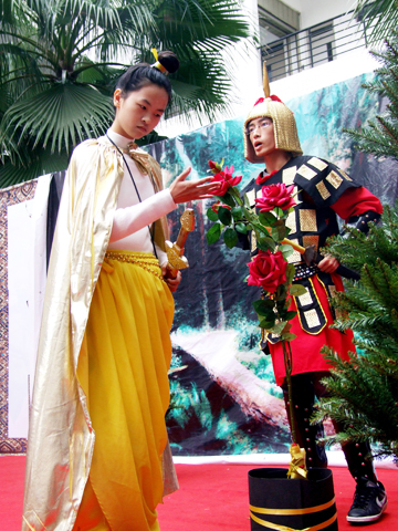 当天最精彩的表演要数泰语07级同学们表演的泰国戏剧《玫瑰的传说》。该剧由廖宇夫老师精心策划,魏晓炜同学担任导演,赵鑫、肖立早、翁桂如等主演。它讲述了天宫里的仙女玛塔纳与哈兴丁武里国王才项凄美的爱情故事。剧情丝丝入扣,扣人心弦。演员们精湛的演技,把本剧推上高潮,最后才项王在玛塔娜化身的玫瑰下郁郁而终。演一出玫瑰传说,叹一出爱情悲剧。